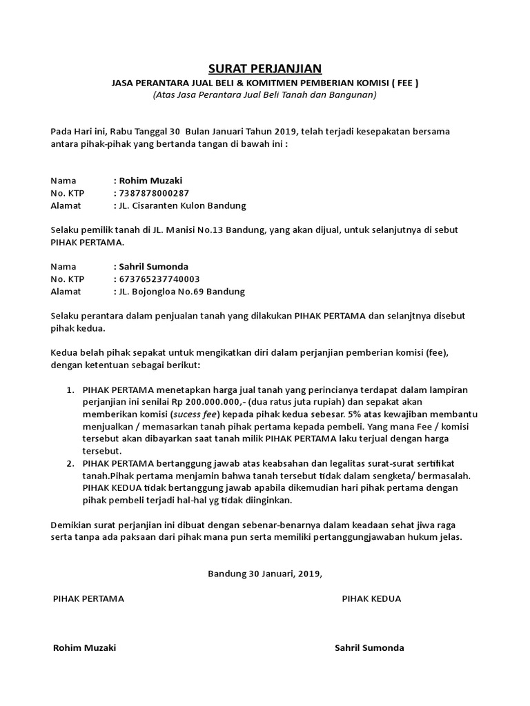 Surat perjanjian komitmen fee jual rumah. Check spelling or type a new query. We did not find results for: Maybe you would like to learn more about one of these?